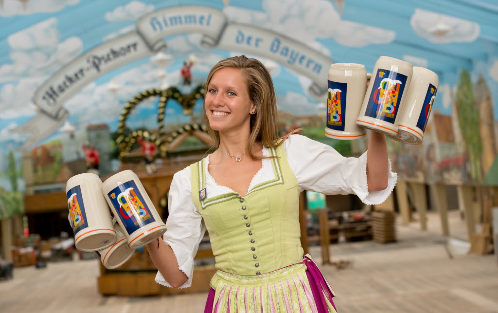 Lisa presents the offical Oktoberfest beer mug on the Oktoberfest grounds in Munich, Germany Tuesday. This year’s beer festival runs Sept. 19, 2015 through Oct. 4, 2015. You write the cutline. (Sven Hoppe/dpa via AP)
