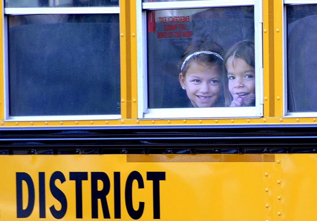 Carlie Chludzinski, 7, left, and Aubrey Pierce, 6, arrive at Clark Elementary School in Harborcreek Township, Pa., on Monday. It was the first day of classes for the Harborcreek School District. (AP Photo/Erie Times-News, ) (Jack Hanrahan/Erie Times-News via AP)