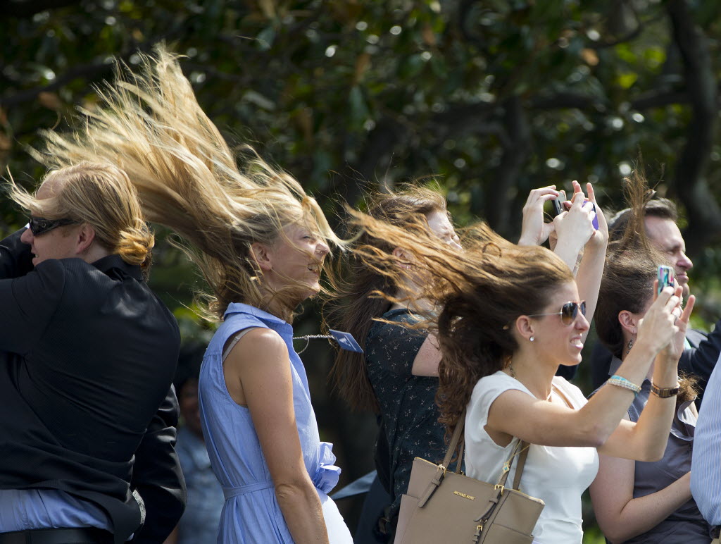 Visitors brace as they react to the rotor wash of Marine One as President Barack Obama takes off from the South Lawn of the White House in Washington Thursday. You write the cutline. (AP Photo/Pablo Martinez Monsivais)