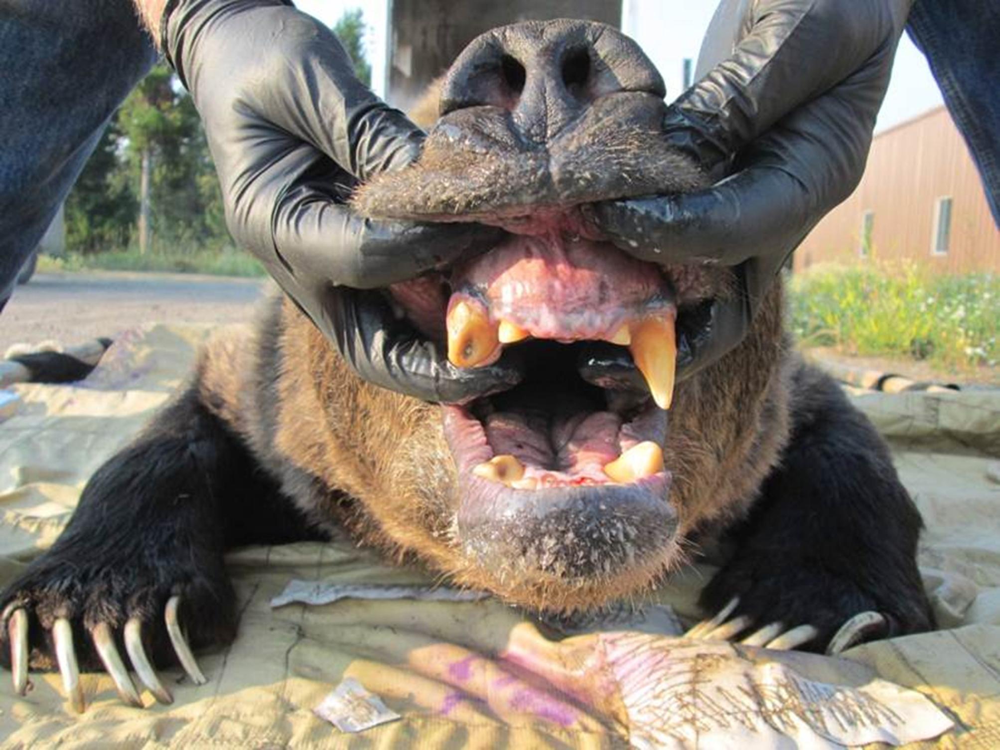 An 25-year-old grizzly with dental problems was euthanized on Aug. 24, 2015, by Idaho Fish and Game biologist after it had been involved in cabin break-ins for food near Island Park.   (Idaho Department of Fish and Game)