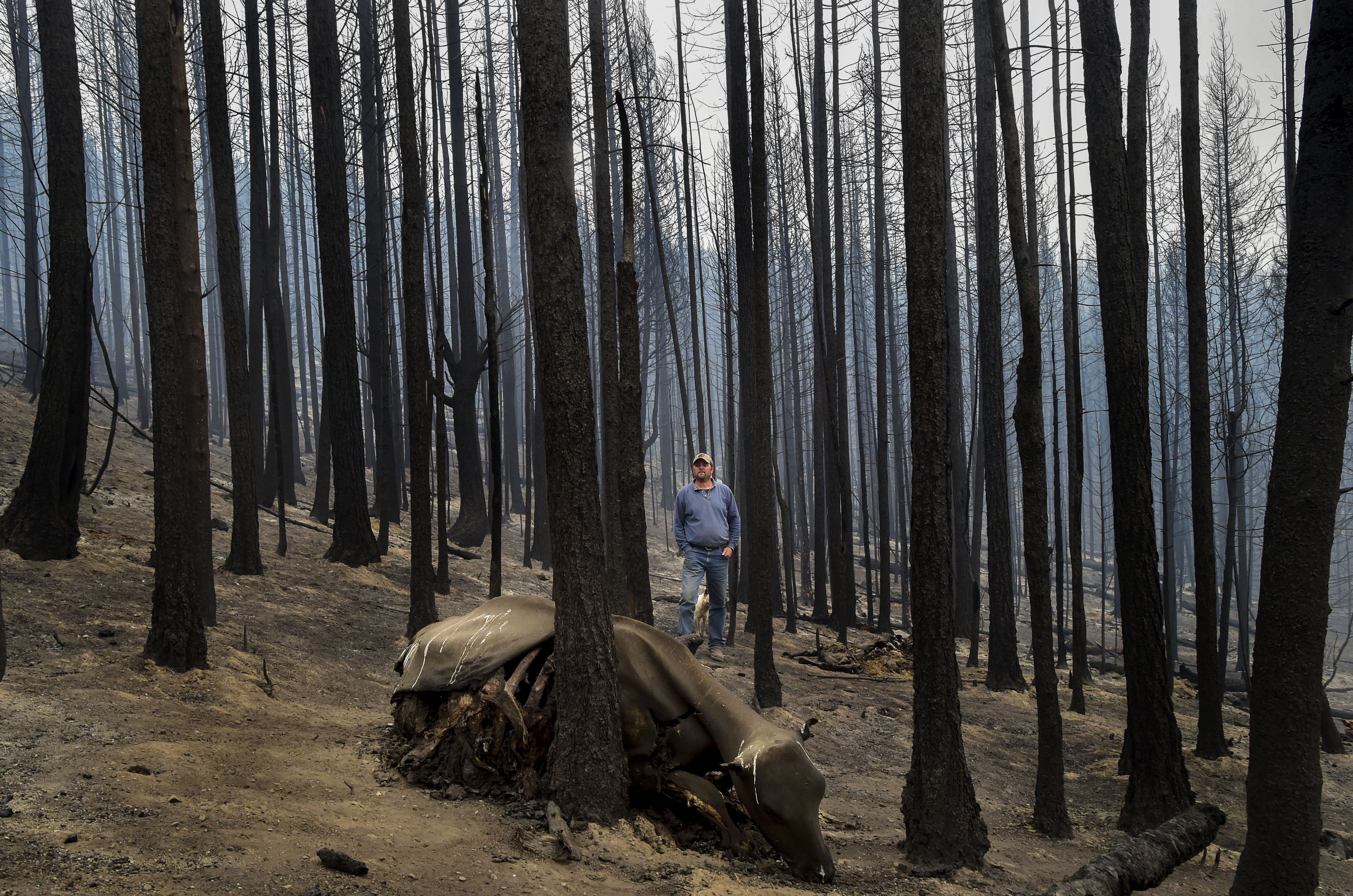 Grumbach is silent. He rubs his jaw and points to another carcass farther up the hill on the grazing land in the Colville National Forest, just south of the Canadian border. The land recently burned in the Stickpin fire.