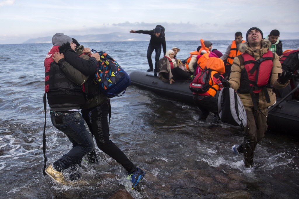 Migrants and refugees react as they arrive on a dinghy from the Turkish coast to the northeastern Greek island of Lesbos earlier today. Greek authorities said in an incident at the southeastern Greek islet of Farmakonissi a number of people have died and others are missing after a boat carrying migrants sank in Aegean Sea. (AP Photo/Santi Palacios)
