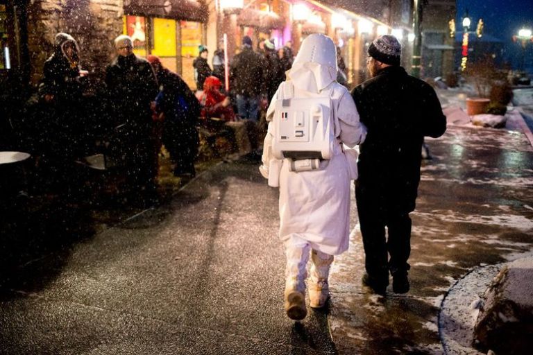 Michelle Brumley, dressed as a Snow Trooper, and Mason Williams walk to the end of the line of more than 100 people waiting for the start of the premiere of “Star Wars: The Force Awakens,” on Thursday at Regal Cinemas Riverstone in Coeur d’Alene. Press story here. (Jake Parrish/Press photo)