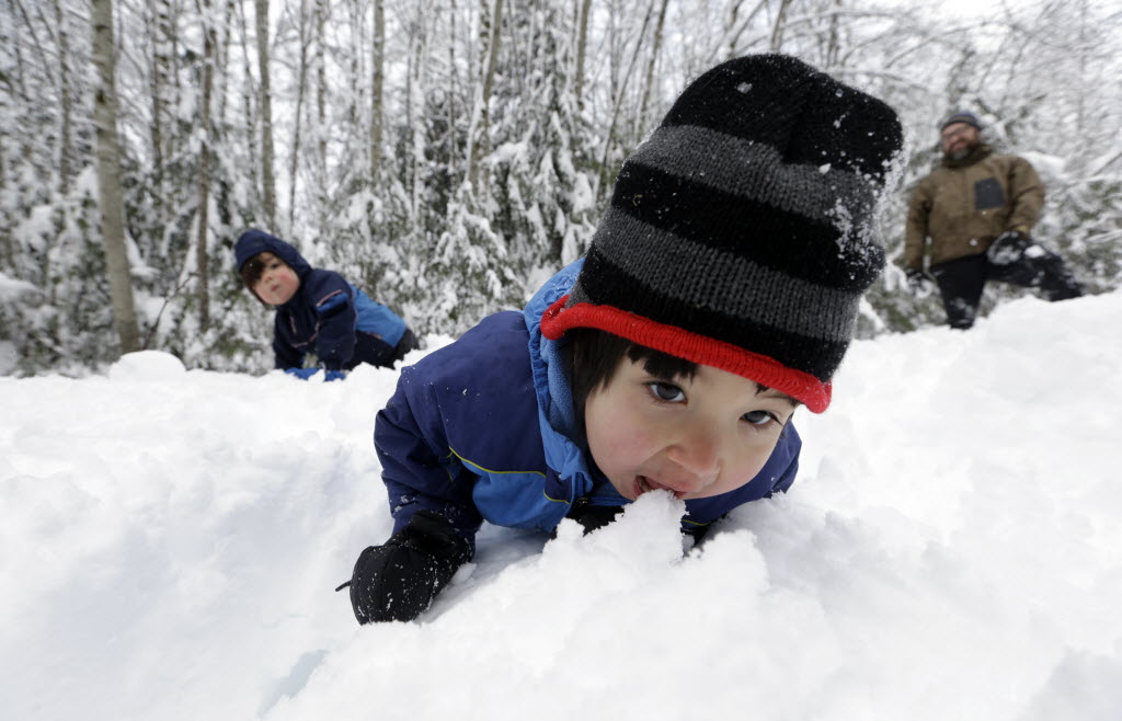 Leon Perkins, 3, leans forward to take a bite of snow as he plays with his brother Conner, left, 2, and his father Erin, Tuesday at Snoqualmie Pass, Wash. You write the cutline. (AP Photo/Elaine Thompson)