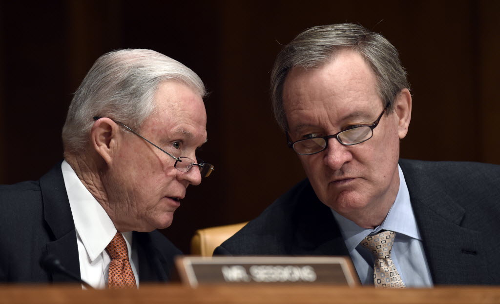 Sen. Jeff Sessions, R-Ala., left, talks with Sen. Mike Crapo, R-Idaho, right, as Office of Management and Budget Director Shaun Donovan testifies before the Senate Budget Committee on Capitol Hill in Washington Tuesday, during a hearing to examine the President’s proposed budget request for fiscal year 2016. (AP Photo/Susan Walsh)