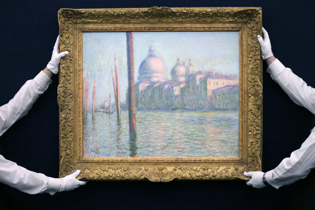 Sotheby’s staff pose for a picture with ‘Le Grand Canal’ by Claude Monet, during a preview of their upcoming Impressionist and Modern, Surrealist and Contemporary Art sale, at the auction house in London, England. “Le Grand Canal,” fetched 23.7 million pounds ($35.6 million) at Sotheby’s, though it didn’t reach the top of its pre-sale estimate of 20 million pounds to 30 million pounds. The Impressionist, Modern and Surrealist auction on Tuesday raised 186.4 million pounds ($280.2 million), the highest-ever total for a single sale in London. (AP Photo/Tim Ireland, File)