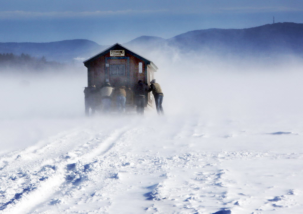 A wind gust whips up snow as a group of ice fishermen from Ashby, Mass., work to push their bob-house across frozen Lake Winnipesaukee, in Meredith, N.H., earlier today Hundreds of fisherman are expected for the upcoming weekend’s annual ice fishing derby. (AP Photo/Jim Cole)