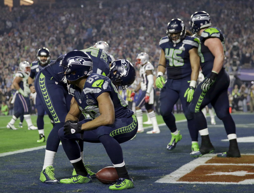 Seattle Seahawks wide receiver Doug Baldwin (89) celebrates a touchdown with wide receiver Jermaine Kearse (15) during the second half of NFL Super Bowl XLIX football game against the New England Patriots Sunday in Glendale, Ariz. (AP Photo/Matt Slocum)