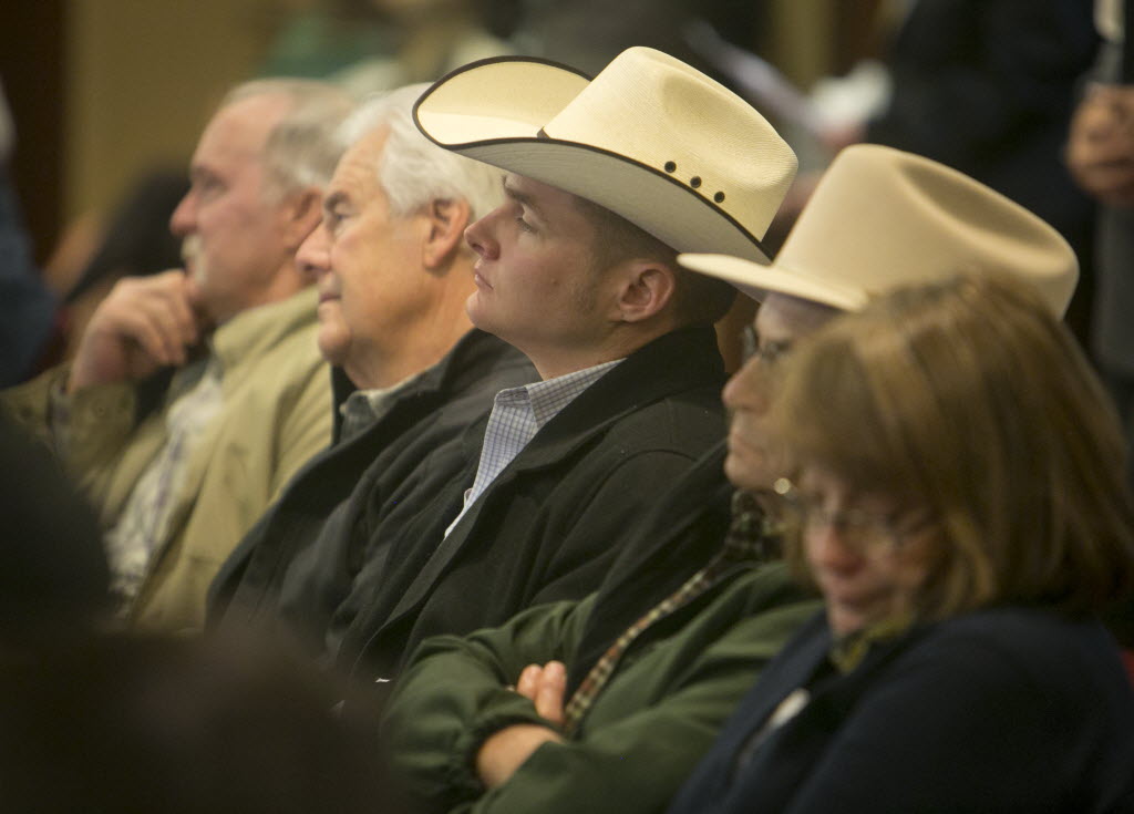 Ryan Finney, from Meridian, center, listens to testimony in the Senate State Affairs Committee about SB1011, which would repeal existing law relating to pari-mutuel betting on historical horse races Monday at the state house in Boise, Id. Finney is opposed to the bill. The committee is currently considering legislation backed by the Coeur d’Alene Tribe that would abolish instant racing in Idaho. Story here. (AP/Statesman photo: Katherine Jones)