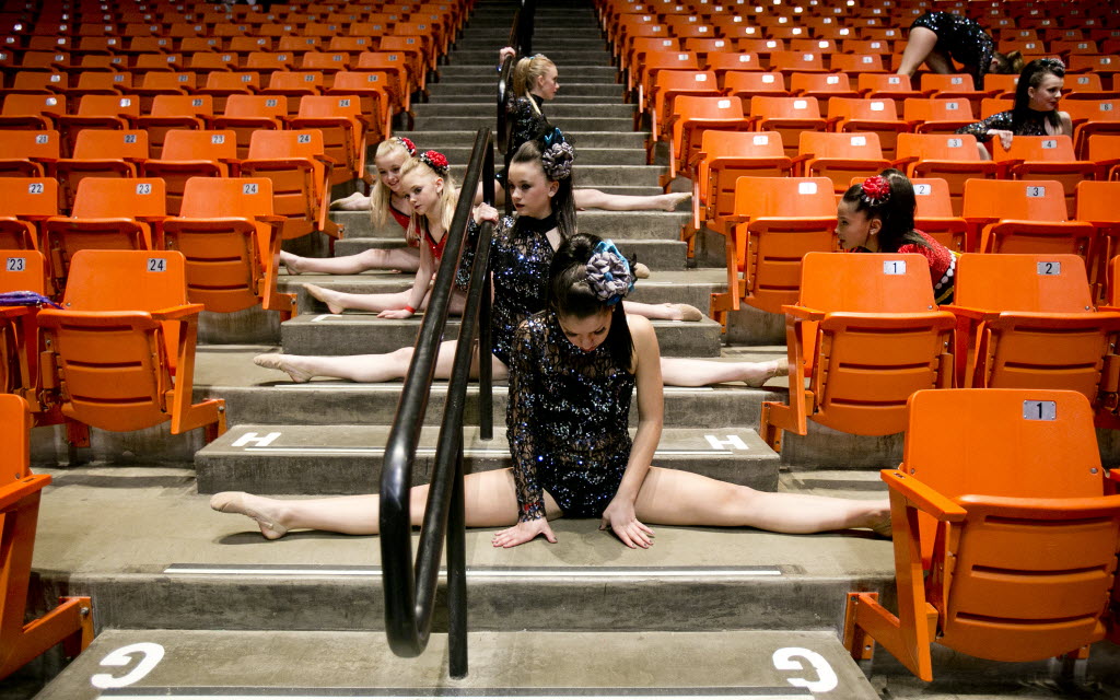 Members of the Eagle Rock Dance Platinum team stretch in a stairway before their audition for America’s Got Talent at Taco Bell Arena Tuesday. The group drove from Idaho Falls to audition for the show, joining thousands of other hopefuls who also auditioned. Story here. (AP/Idaho Statesman photo: Kyle Green)