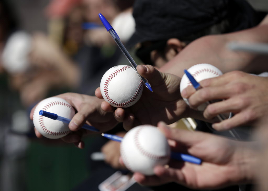 San Francisco Giants fans holds baseballs and pens in hopes for getting an autograph as players arrive for spring training baseball workouts today in Scottsdale, Ariz. Giants pitchers and catchers have their first official workout scheduled for Thursday. (AP Photo/Darron Cummings)