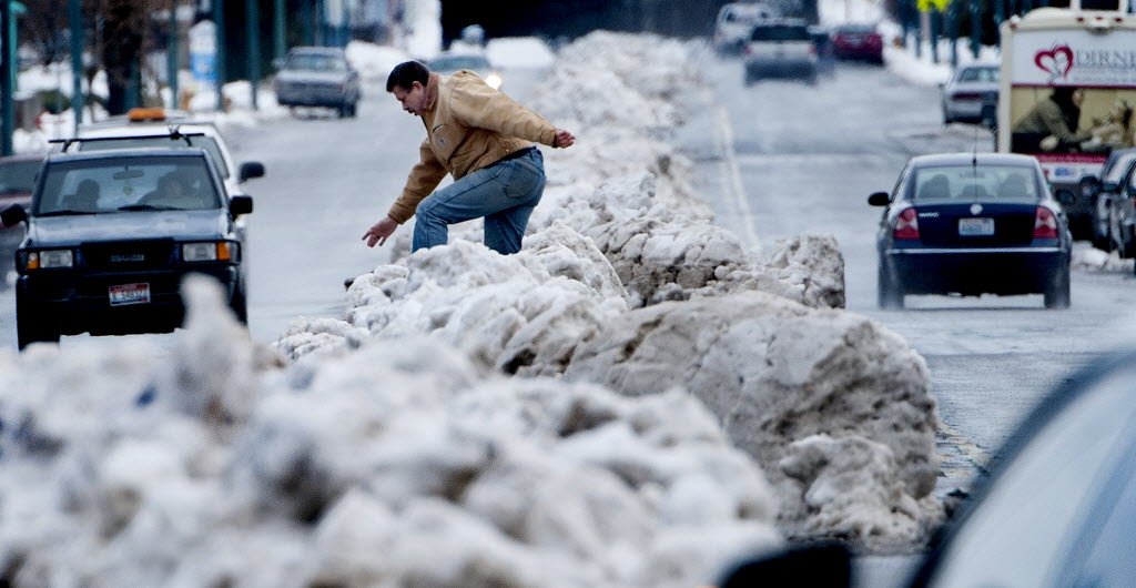 A pedestrian climbs over the three-foot snow berms in the turning lanes of Sherman Avenue in downtown Coeur d’Alene on Tuesday. (SR photo: Kathy Plonka)