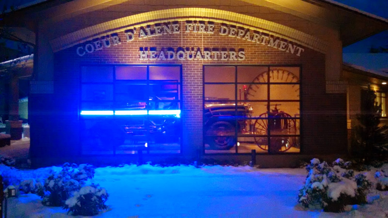 Blue lights have been placed in the window of the Coeur d’Alene Fire Department’s Administration building at 320 Foster Ave., to honor law enforcement. The gesture is part of the Project Blue Light national campaign. The lights were installed last week will remain in place until next week. More here . (Coeur d’Alene Today photo: Keith Erickson)