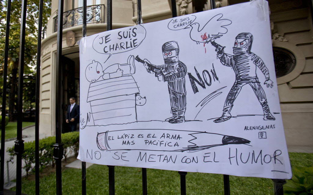 A cartoon style drawing hangs outside France’s embassy in Buenos Aires, Argentina, today that reads in Spanish “The pencil is the most peaceful weapon, don’t mess with humor” in solidarity with those killed in an attack at the Paris offices of the weekly newspaper Charlie Hebdo. Masked gunmen stormed the offices of the satirical newspaper that caricatured the Prophet Muhammad, methodically killing 12 people Wednesday, including the editor, before escaping in a car. It was France’ deadliest postwar terrorist attack. (AP Photo/Natacha Pisarenko)