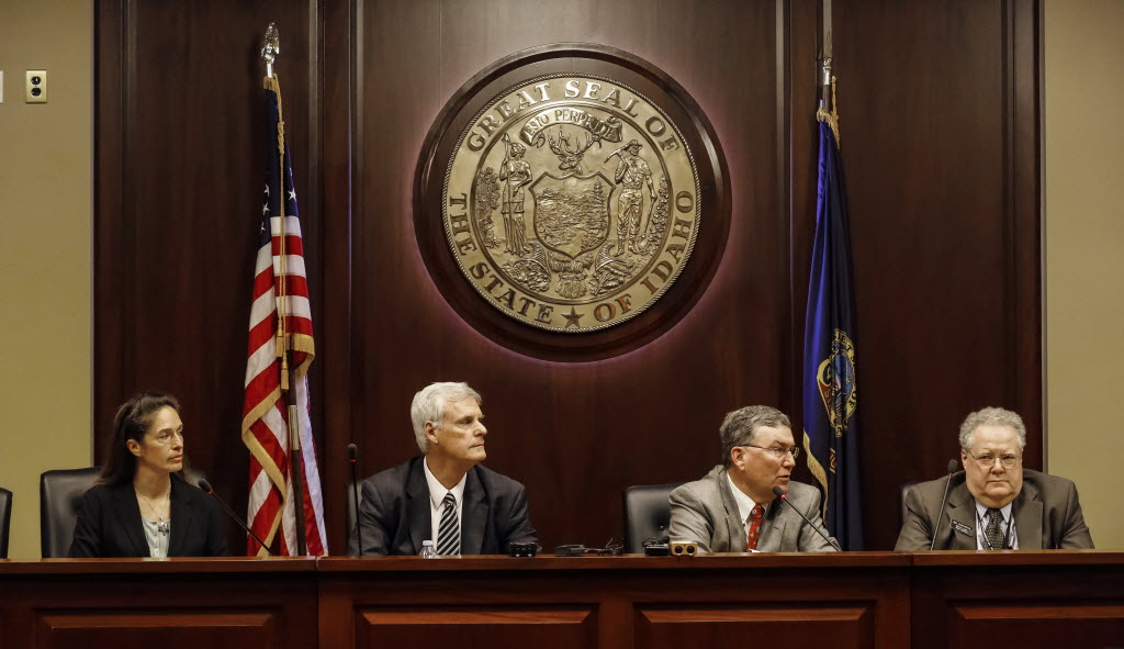 From left, Idaho Senate Minority Leader Michelle Stennett, D-Ketchum, Senate President Pro Tem Brent Hill, R-Rexburg, House Speaker Scott Bedke, R-Oakley, and House Minority Leader John Rusche, D-Lewiston talk with reporters at the State Capitol about the upcoming 2015 legislative session at the State Capitol building this morning in Boise. The new session begins Monday. Story below. (AP Photo/Otto Kitsinger)