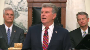 (IDEDNEWS photo: Gov. Butch Otter, center, presents his State of the State address Monday at the Statehouse)
