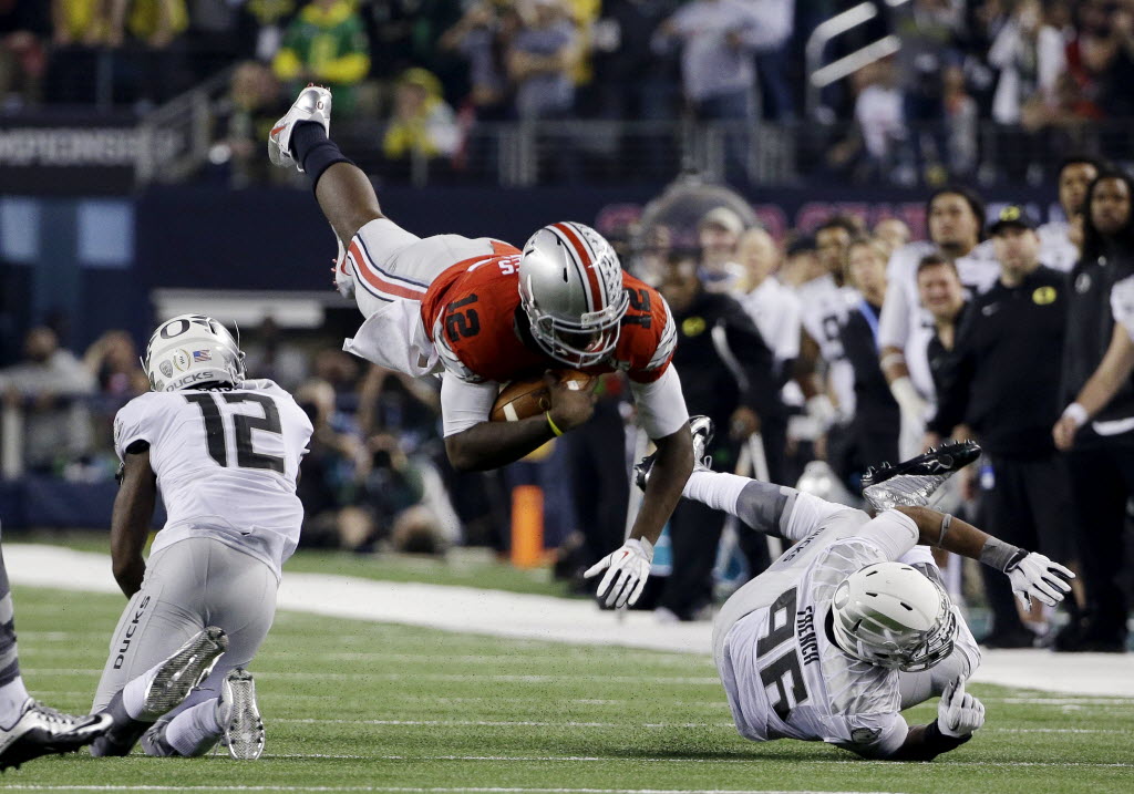 Ohio State QB Cardale Jones (12) dives for a first down during the second half of the NCAA college football playoff championship game against Oregon Monday in Arlington, Texas. Ohio State won the first college football championship of the playoff era 42-20 over Oregon. Game story here. (AP Photo/David J. Phillip)
