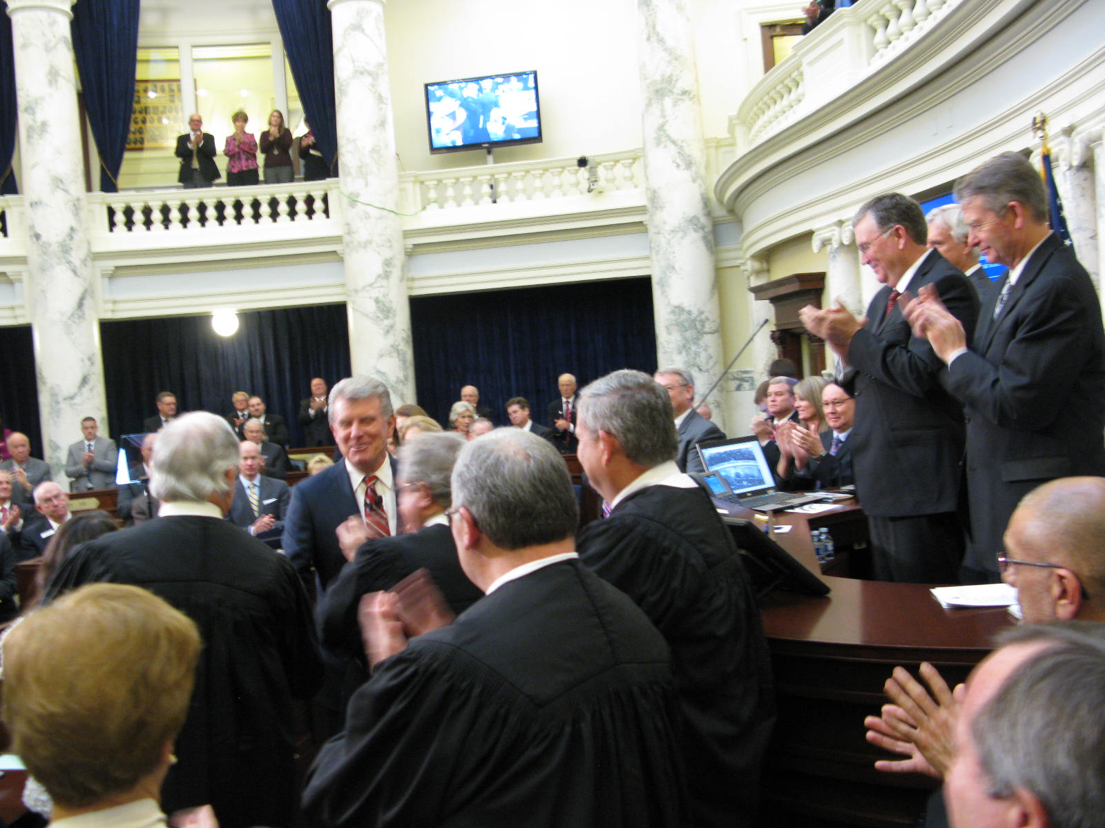 “Ladies and gentlemen, look high above you,” Gov. Butch Otter told lawmakers as he concluded his State of the State message today. “Within this magnificent chamber so beautifully renovated just a few years ago, you see an Idaho sky through a vaulted dome of glass. This chamber, this building, this body has all the room that anyone could need to accommodate the biggest, loftiest and most meaningful ideas and actions.”