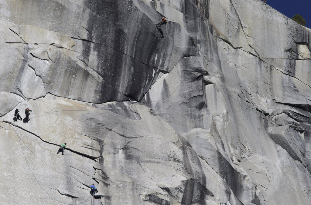 Kevin Jorgeson of California, wearing green, and 36-year-old Tommy Caldwell, wearing blue lower right, climb near the summit of El Capitan today, as seen from the valley floor in Yosemite National Park, Calif. The two climbers vying to become the first in the world to use only their hands and feet to scale a sheer granite face in California’s Yosemite National Park are almost to the top. Jorgeson and Caldwell have been attempting what many thought impossible. The men have been “free-climbing” to the 3,000-foot summit for 17 days, meaning they don’t use climbing aids other than ropes only to prevent deadly falls. Each trained for more than five years, and they have battled bloodied fingers and unseasonably warm weather. (AP Photo/Ben Margot)