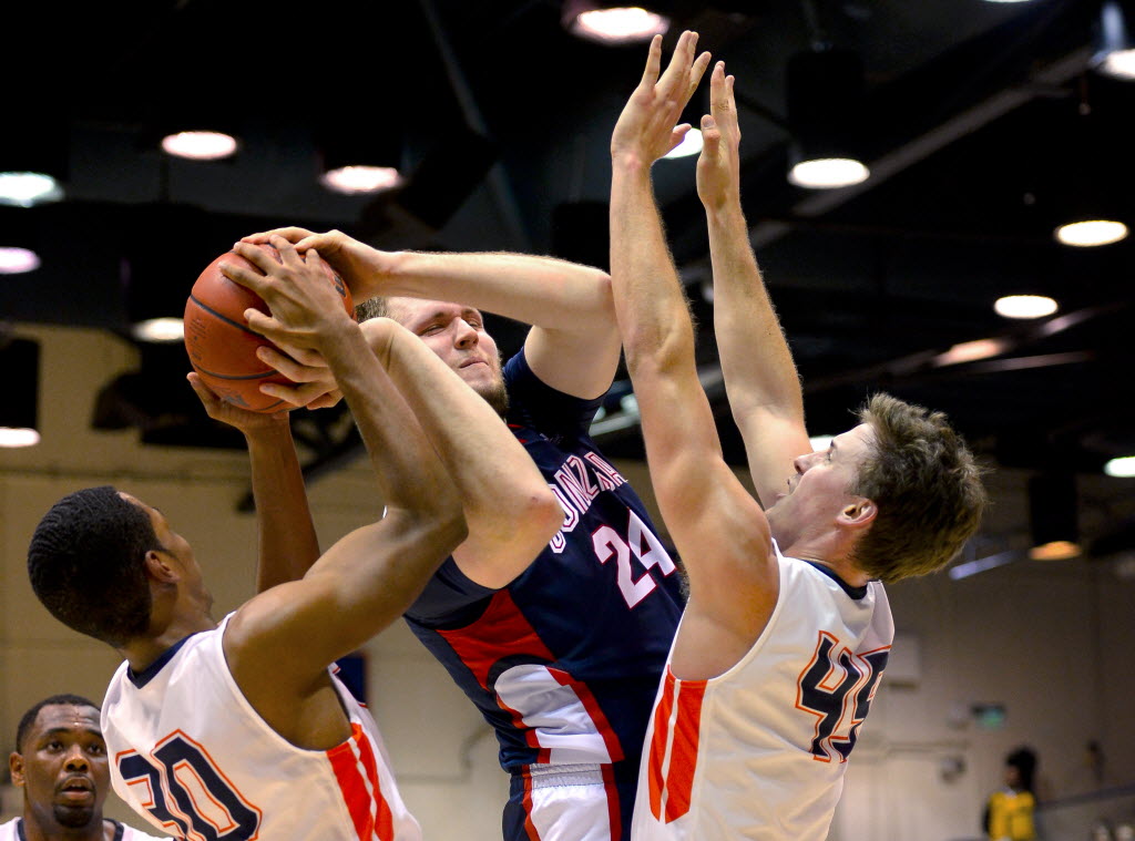 Gonzaga center Przemek Karnowski (24) battles Pepperdine’s Lamond Murray Jr. (30) and forward Jett Raines (45) for the ball during the first half of an NCAA college basketball game Thursday in Malibu, Calif. Story here. (AP Photo/Gus Ruelas)