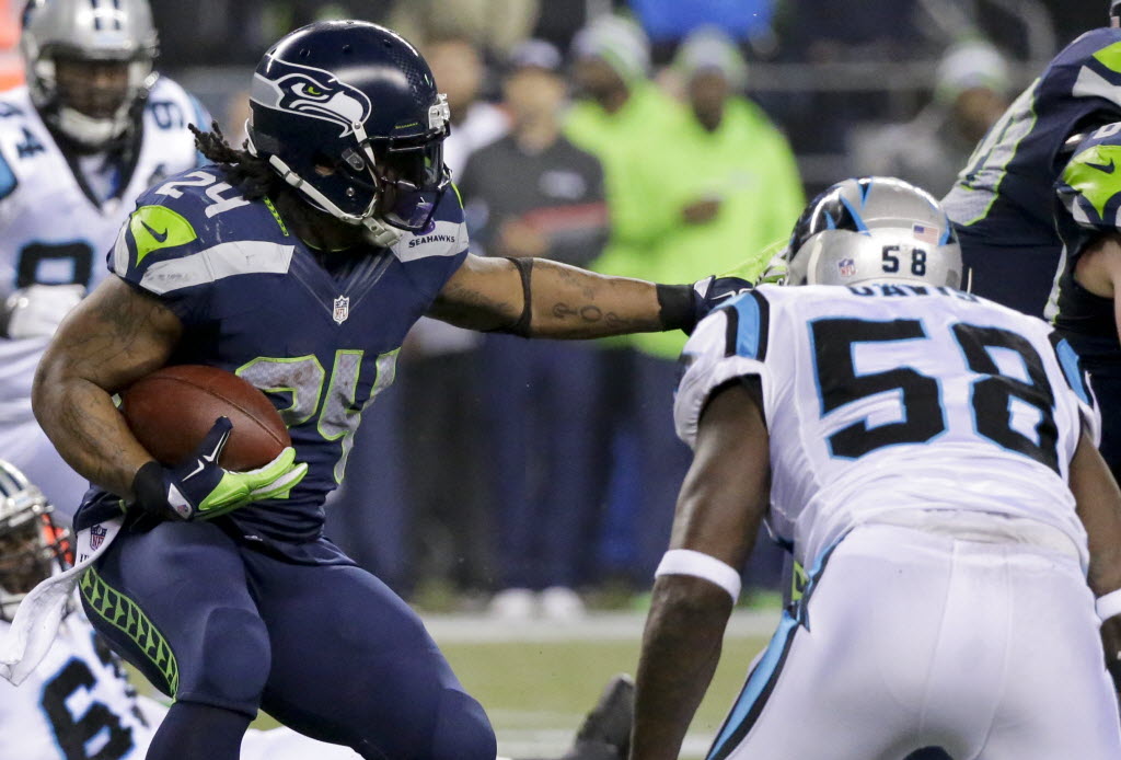 Seattle Seahawks running back Marshawn Lynch, left, runs against Carolina Panthers outside linebacker Thomas Davis (58) during the first half of an NFL divisional playoff football game in Seattle last week. (AP Photo/Ted S. Warren)