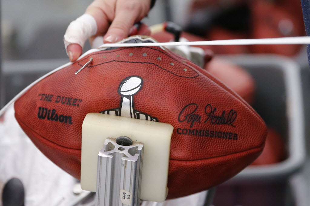 Heather Wireman laces up an official game ball for NFL football’s Super Bowl XLIX at the Wilson Sporting Goods Co. in Ada, Ohio, Tuesday. The New England Patriots face the Seattle Seahawks for the NFL championship on Sunday in Glendale, Ariz. (AP Photo: Rick Osentoski)