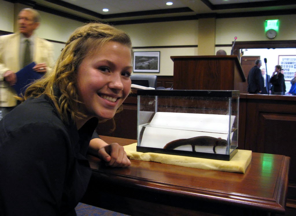 Ilah Hickman poses for a photo with a young Idaho giant salamander at the Capitol in Boise Monday. Idaho lawmakers worried that special recognition of the Idaho giant salamander could lead to federal protections have rejected a grade school student’s request that it be named the state amphibian. (AP Photo/The Spokesman-Review, Betsy Z. Russell)