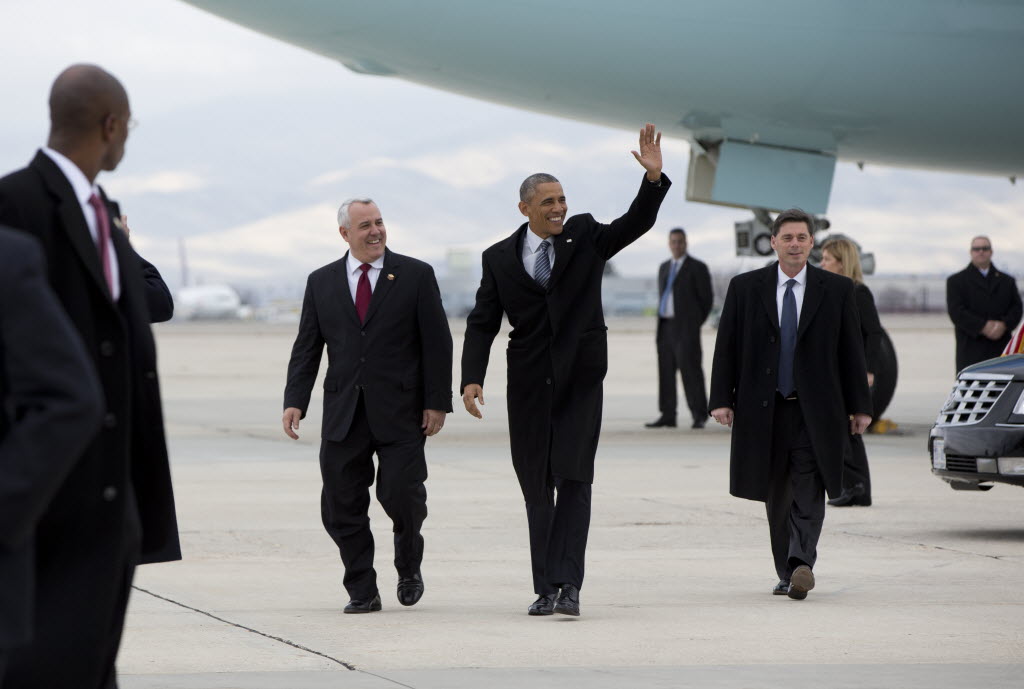 President Barack Obama walks on the tarmac with Boise Mayor David Bieter after arriving on Air Force One today at Gowen Field Air National Guard Base in Boise en route to Boise State University, where he will discuss the themes in his State of the Union address. (AP Photo: Carolyn Kaster)