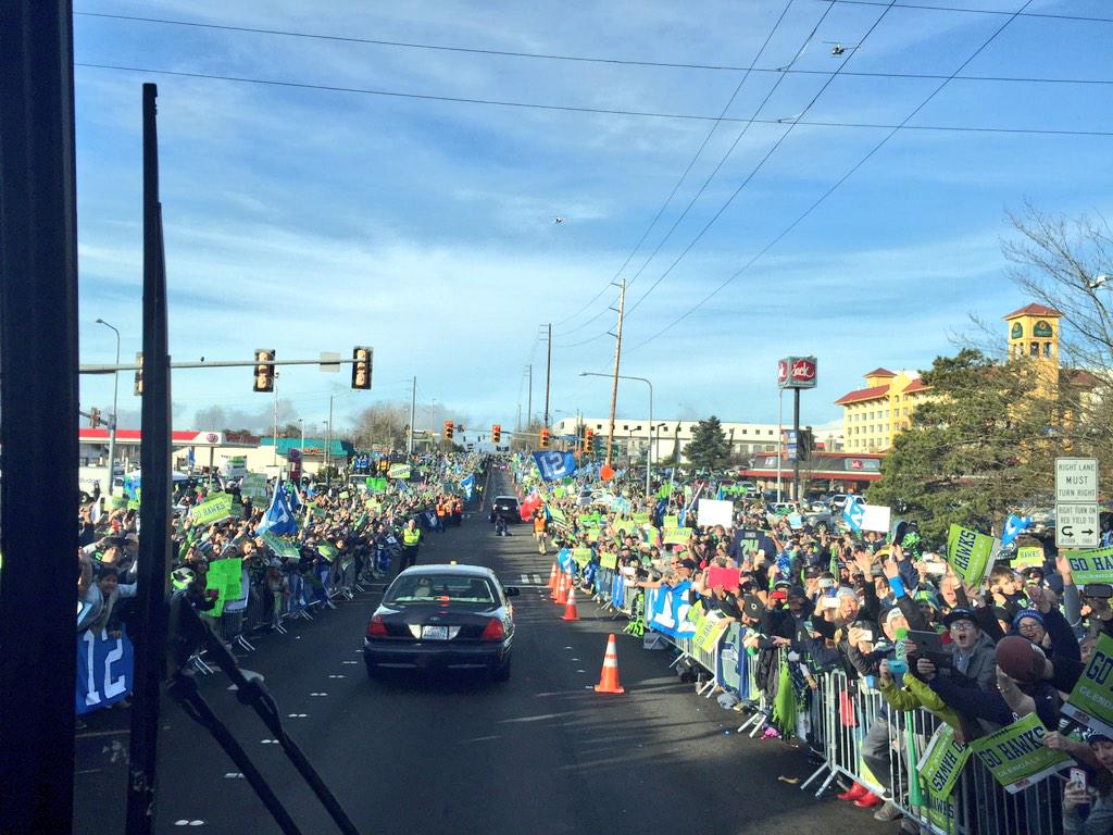 • Yes, the Hawks are in Phoenix, ready to deal with the run-up to the Super Bowl. But their arrival yesterday wasn’t as interesting as their departure from Seattle. The route to the airport was lined with 12s, even though it was well before noon on a Sunday. In some spots, the crowd was as deep as the Rose Parade gatherings New Year’s Day in Pasadena. And the players noticed . Boy, did they notice. Twitter was full of pictures (the one here comes from Pete Carroll) and comments. Though no one seemed to grab a photo of the family of four, mom, dad and two little ones, all saluting the passing buses by grabbing their, well, you know where. Thanks Marshawn. You know, I consider myself a sports fan. I love baseball. I love basketball. I love football. I really like other sports, including tennis, golf and soccer. But I don’t think there is anything, not a Gonzaga national championship, a WSU Rose Bowl victory, a Mariners’ World Series title, that would excite me enough to stand on a street corner for a glimpse of a passing bus. Maybe when I was younger, sure. But not since I was 25 or so. It was somewhere in that time I came to realize people who play sports are just people. They aren’t special, except for their physical abilities. Some are top-notch folks. People you want to be around. Others are, well, they aren’t. They have a job to do. That job entertains us. We appreciate it. But in the grand scheme of things, well, it’s entertainment. Now, if someone were able to bring peace to the Middle East or to eliminate hunger or eradicate the disease of terrorism, then I would probably drag my sorry feet out to the curb to wave and show my appreciation. Don’t get me wrong. I do understand the love those folks showed yesterday in Seattle. What they did is not for me. But I do get it. It’s a way of feeling a part of something. It’s a way of showing their team how much they enjoy what they do. It’s a way of saying thanks. More power to them. And, win or lose, I’m sure a majority of the people lining the streets yesterday will be there when the Hawks return. That’s admirable.