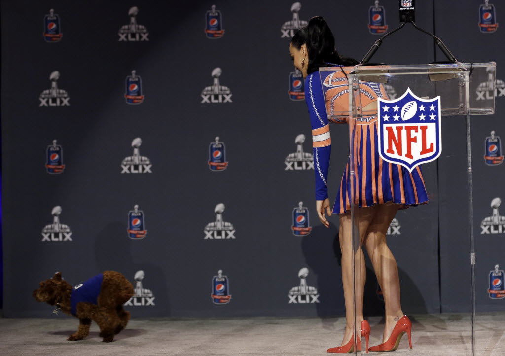 Since the first photo I tried today didn’t get much action, let’s try again. Here’s singer Katy Perry, who’ll perform at halftime Sunday, chasing after her dog Butters at a halftime news conference for NFL Super Bowl XLIX football game today in Phoenix. You write the cutline. (AP Photo/Morry Gash)