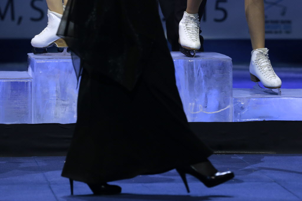 Skaters leave the podium with flower model passing by during victory ceremony for ice dance at the European Figure Skating championships in Stockholm, Sweden, Thursday. (AP Photo/Ivan Sekretarev)