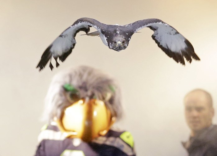 “Taima” flies out of a tunnel and onto the field ahead of the Seattle Seahawks’ mascot “Blitz,” before a 2013 NFL football game against the Arizona Cardinals in Seattle. (AP file photo: Elaine Thompson)