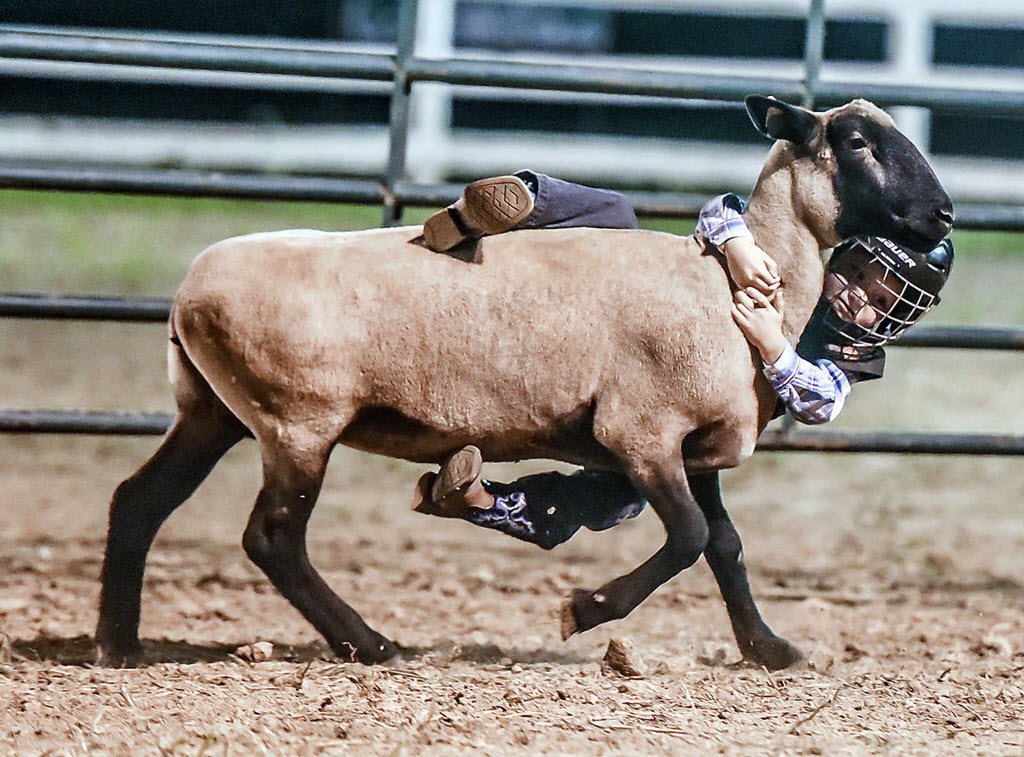 Keegan Sparks holds on during the mutton bustin’ competition at the Garrard County Fair near Lancaster, Ky., recently. You write the cutline. (Clay Jackson/The Advocate-Messenger via AP)