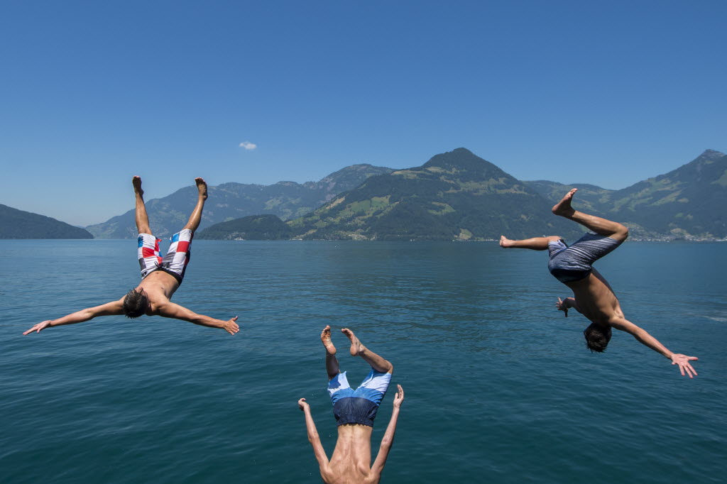 Young men jump into Lake Lucerne, near Beckenried, Switzerland, on Wednesday. The European weather forecast is promising high temperatures for the next few days. (Urs Flueeler/Keystone via AP)