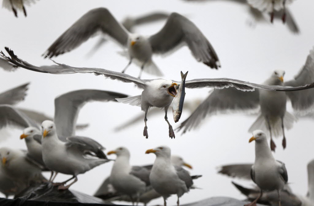 A gull flips a herring in order to swallow it whole while flying away with a meal robbed from a delivery truck earlier today in Rockland, Maine. You write the cutline. (AP Photo/Robert F. Bukaty)