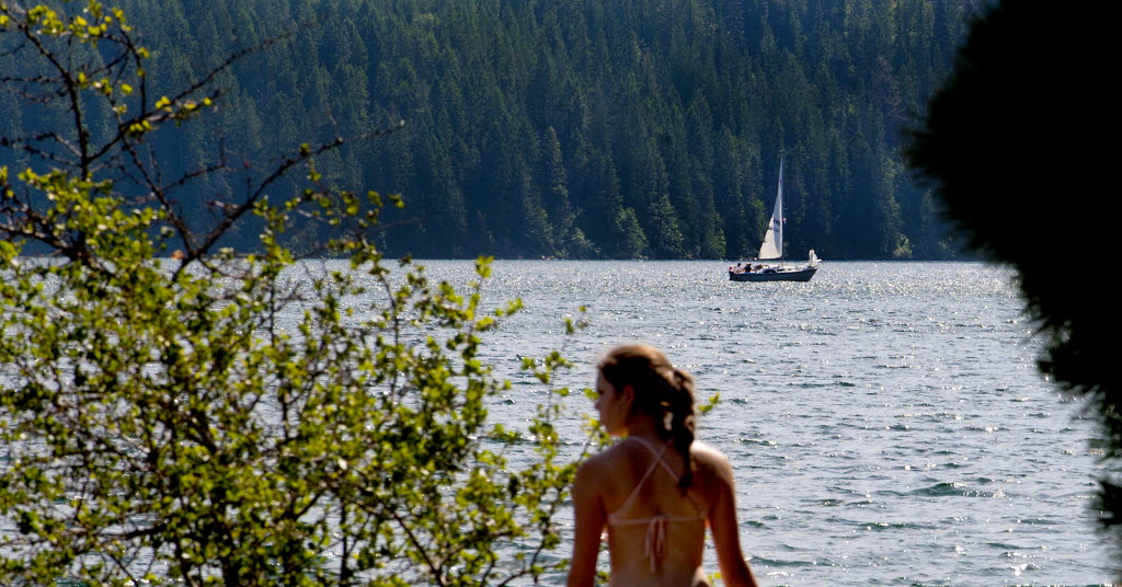 In this June 23 SR file photo, a sailboat cruises past a swimmer at Farragut State Park in Bayview on Tuesday. Farragut is reopening facilities that were closed due to the Cape Horn Fire, with the Eagle Boat Launch reopening today, day-use and beach areas opening tomorrow and the two campgrounds that had been evacuated, Snowberry and Whitetail, reopening on Friday. Story here. (SR file photo: Kathy Plonka)