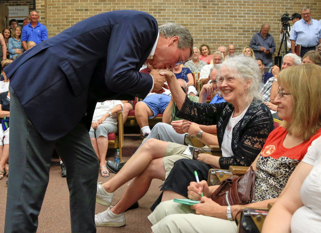 Republican presidential candidate former Florida Gov. Jeb Bush kisses the hand of Rita Held of Sioux City, during a meet and greet event in Sioux City, Iowa, Monday. The kiss came after Bush said the Republicans should not run an angry campaign. You write the cutline. (AP Photo/Nati Harnik)