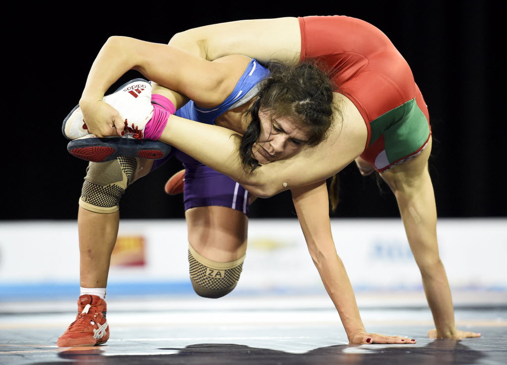 Peru’s Yanet Sovero, left, competes against Mexico’s Alejandra Romero in the women’s freestyle 58kg bronze medal wrestling bout during the Pan Am Games in Toronto Thursday. You write the cutline. (Nathan Denette/The Canadian Press via AP)