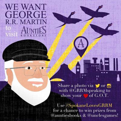 The local bookstore is requesting that fans and followers use #SpokaneLovesGRRM on social media to show their appreciation for the A Song of Fire and Ice scribe. Participants are also eligible to win prizes from Auntie’s Bookstore and Uncle’s Games .