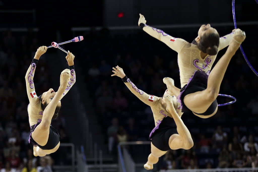 Canada’s team performs during rhythmic gymnastics group clubs and hoops competition in the Pan Am Games in Toronto Monday, July 20, 2015. Canada won the bronze medal in the event. (AP Photo/Gregory Bull)