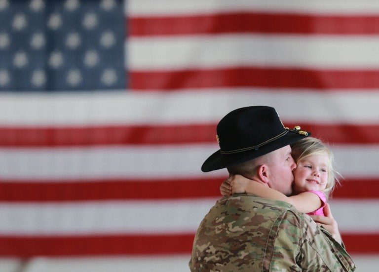 U.S. Army 1st Lt. Derek Phillips kiss his daughter Leah Phillips, 2, as she gives him a hug at the conclusion of a casing of the squadron colors ceremony today at Fort Bliss’ Biggs Army Airfield in El Paso, Texas. The unit, which flies Apache helicopters, is being deployed to Kuwait and Iraq as part of a normal rotation. They will be replacing a sister unit. (Victor Calzada/The El Paso Times via AP)