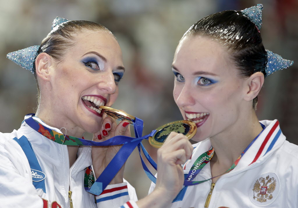 Russia’s gold medalists Natalia Ishchenko and Svetlana Romashina pose after the medal ceremony for the synchronized swimming duet free final at the Swimming World Championships in Kazan, Russia, earlier today. You write the cutline. (AP Photo/Michael Sohn)