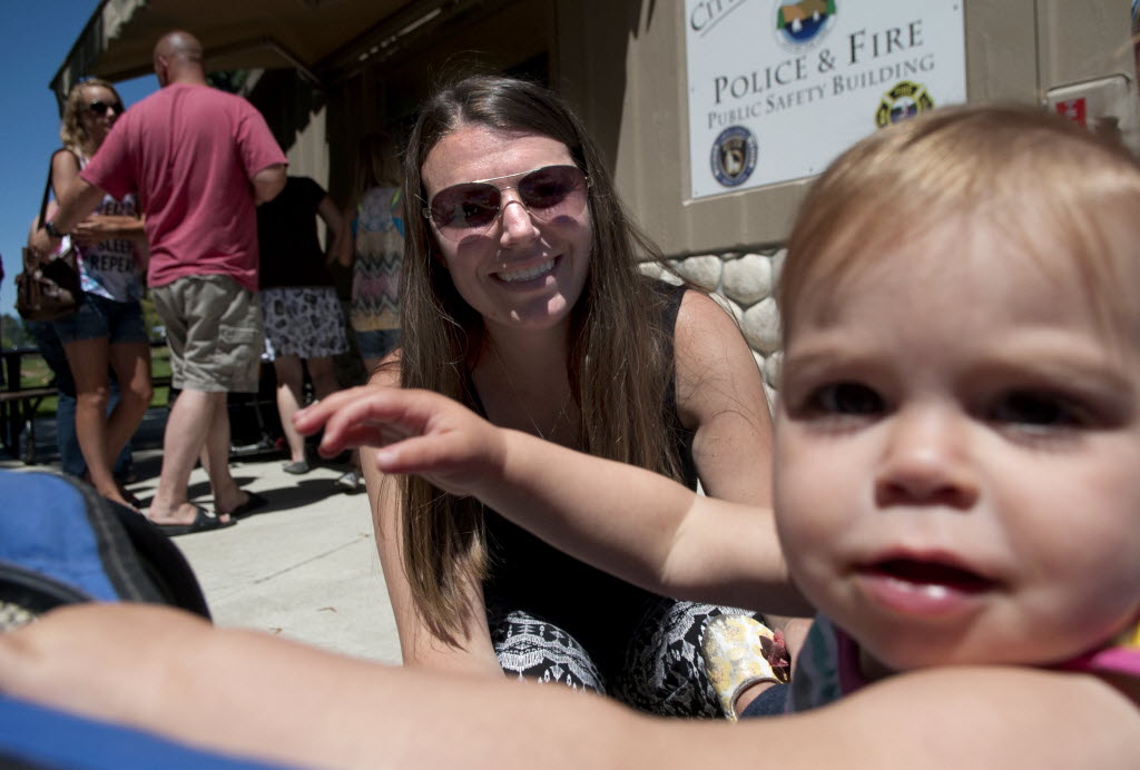 Fallen officer Stg. Greg Moore’s daughter Gemma Moore, 1, smiles for the camera as she and her mother Lindy attended the lemonade stand in Coeur d’Alene on Saturday in support of Kiahna Kirk’s family. Kiahna hosted a lemonade stand in honor of fallen officer Sgt. Greg Moore. Right after Greg’s death Kiahna sold lemonade, and baked goods and raised $200 that she donated to the Moore family. Just a few weeks later on May 31st Kiahna’s father was killed in a car accident on U.S. 95. Her father Jeffrey Kirk left behind 4 children, his parents, and extended family. On Saturday the Coeur d’Alene Police Department along with several other law enforcement agencies hosted the lemonade stand to benefit Kiahna and her family. (SR photo: Kathy Plonka)