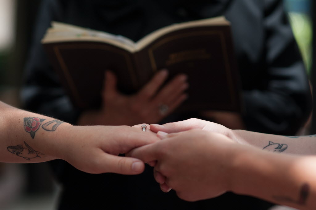 Moriah Martin, left, and Jordyn Dolente exchange rings during their wedding ceremony at the Athens-Clarke County Courthouse in Athens, Ga., today. They were the first gay couple wed in Athens-Clarke County following Friday morning’s historic U.S. Supreme Court hearing legalizing gay marriage nationwide. (AJ Reynolds/Athens Banner-Herald via AP)