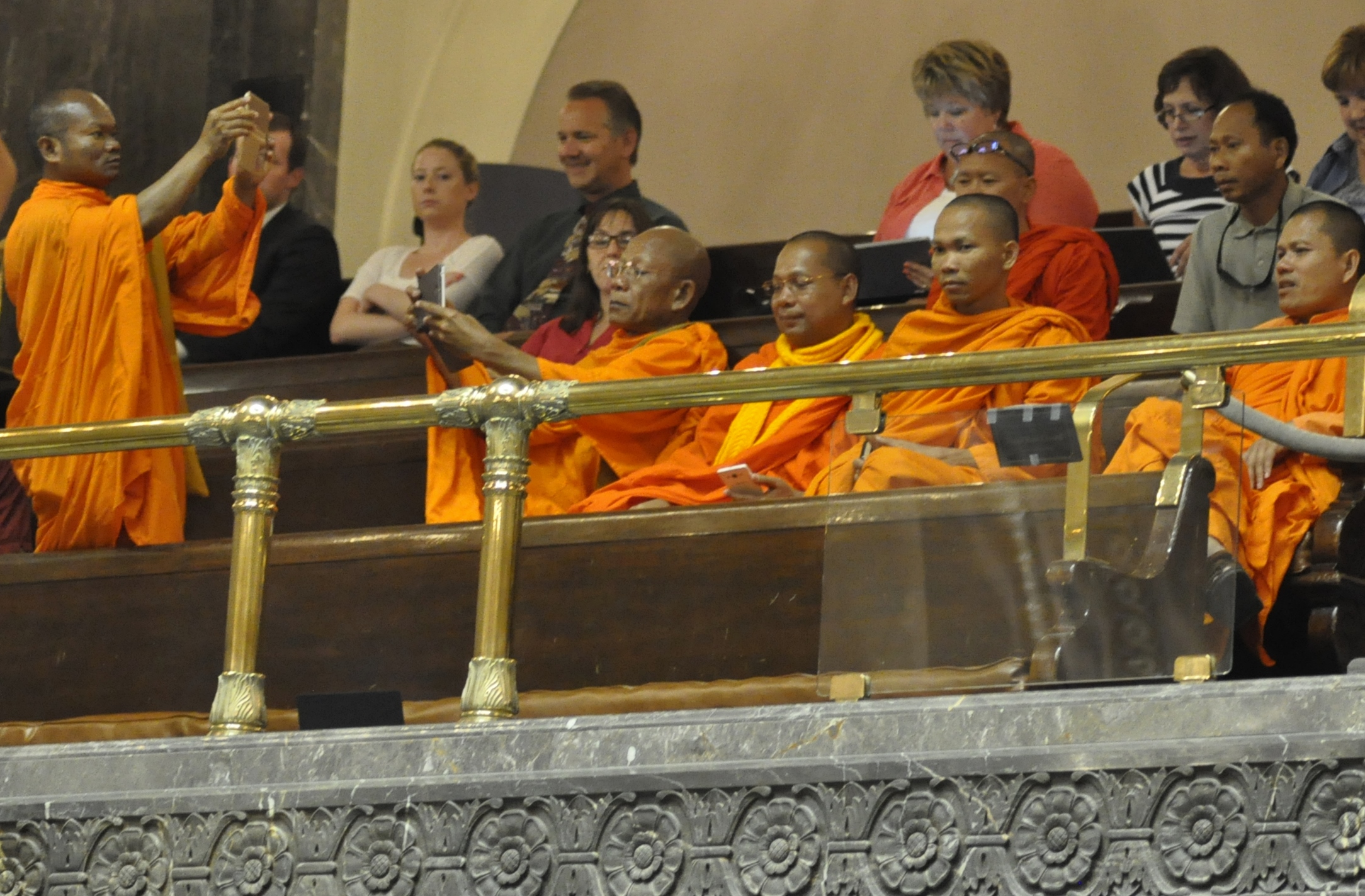 And there’s a bit of good karma in the chamber that may boost the budget’s chances… five Buddhist monks are watching from the gallery.