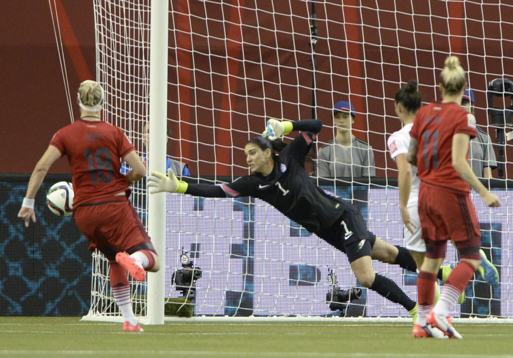 U.S. keeper Hope Solo watches as a Germany shot goes wide of the net during the second half of a semifinal in the Women’s World Cup soccer tournament, Tuesday in Montreal, Canada. The US leads 1-0 in the 81st minute. (Ryan Remiorz/The Canadian Press via AP)
