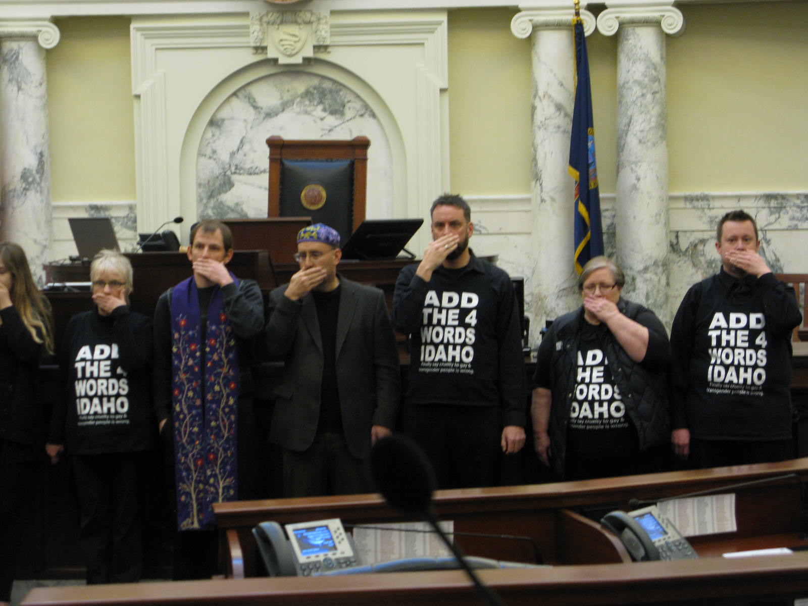 A statement from the protesters says, “Today the 22 of us stand peacefully, silently and respectfully in place in the Capitol where we will stay until serious consideration is given to a bill to add the 4 words to Idaho law, showing the Idaho Legislature’s respect for religious values and the golden rule. We are ordinary Idaho citizens of all ages and backgrounds. We are gay, straight, transgender, we are parents, grandparents, clergy, business owners and community leaders. We stand for the two-thirds of Idaho that supports this legislation.”