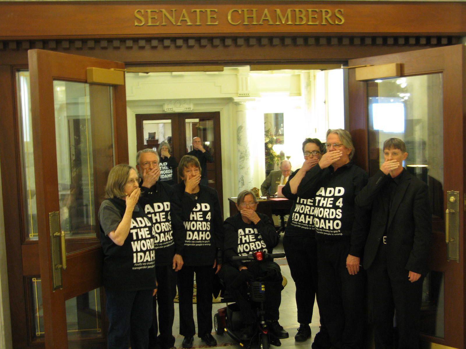 ‘Add the 4 Words’ protesters are standing in the chamber of the Idaho House this morning and refusing to leave, and blocking the main entrance to the Senate chamber, calling for consideration of legislation to add the words “sexual orientation” and “gender identity” to the Idaho Human Rights Act, to ban discrimination on those bases in housing, employment and public accommodations in Idaho. Legislation to make that change was the subject of a lengthy public hearing earlier this session in a House committee, but was voted down on a party-line vote, with all Republicans on the House State Affairs Committee opposing it, and minority Democrats supporting it.