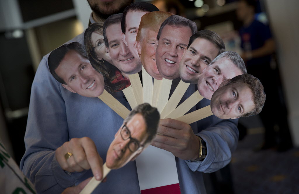 Adam Gabbatt of The Guardian newspaper holds images of possible Republican candidates, from left, former Pennsylvania Sen. Rick Santorum, former Alaska Gov. Sarah Palin, Sen. Ted Cruz, R-Texas, Wisconsin Gov. Scott Walker, Donald Trump, New Jersey Gov. Chris Christie, Sen. Marco Rubio, R-Fla., former Florida Gov. Jeb Bush, Sen. Rand Paul, R-Ky., and, former Texas Gov. Rick Perry, bellow, as he interviews Howard “Cowboy” Woodward during the Conservative Political Action Conference (CPAC) in National Harbor, Md., Thursday. You write the cutline. (AP Photo/Carolyn Kaster)