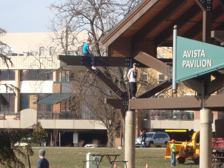On her daily walk on the Coeur d’Alene waterfront last week, Walkabout spotted these “birds” hanging out from perches on the new Avista Pavilion in the heart of McEuen Park.
